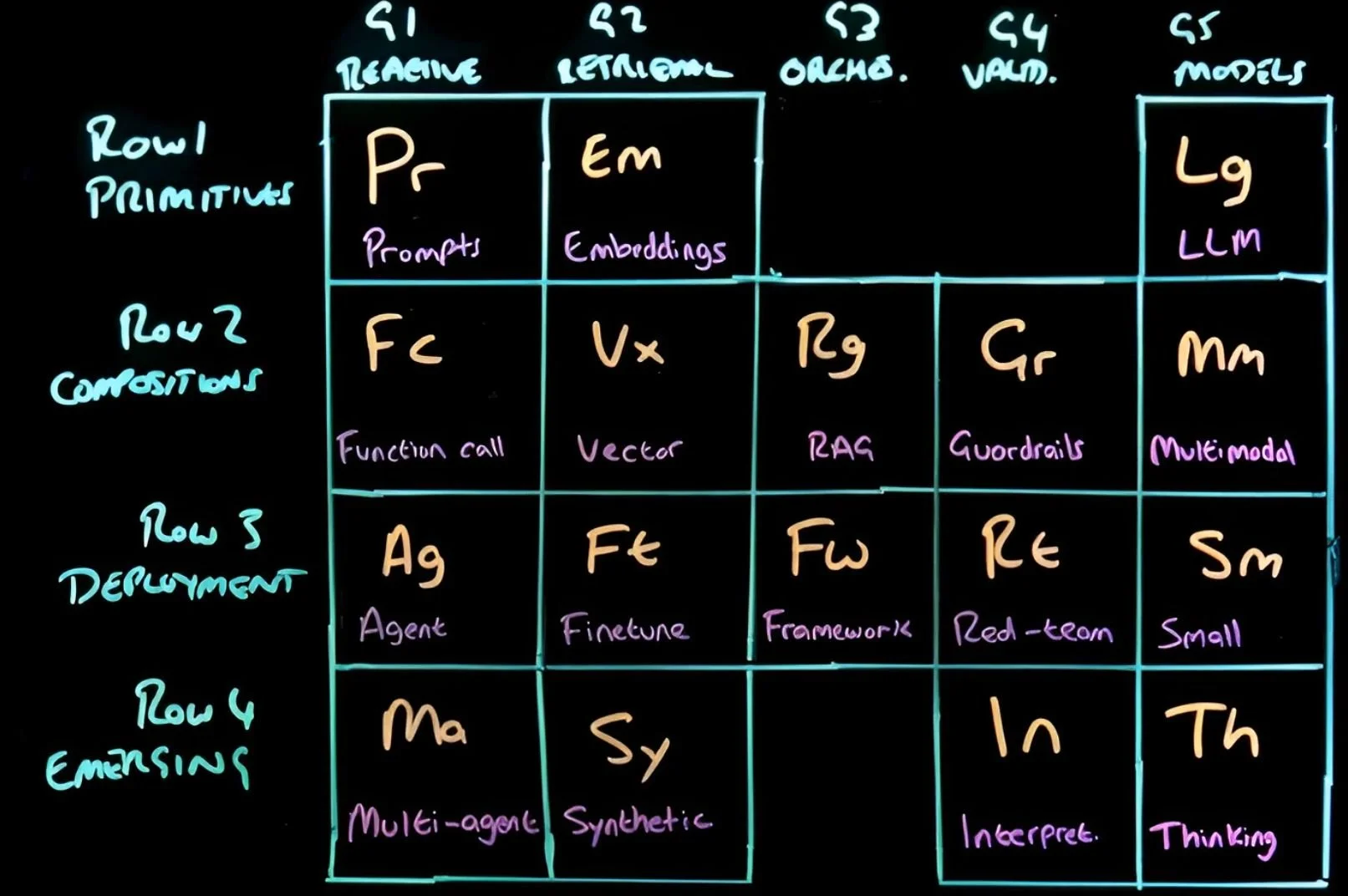 Rows build from basics to advanced (Primitives, Compositions, Deployment, and Emerging) and the columns group by family (Reactive, Retrieval, Orchestration, Validation, Models).